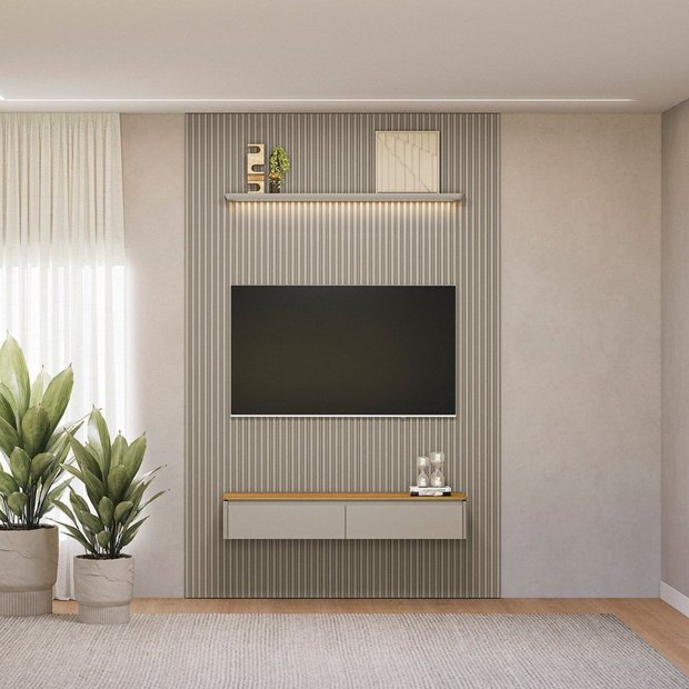 Painel Ripado para TV até 75 Polegadas com LED MDF 180cmx250cm Modular Tauari/Gris Fosco