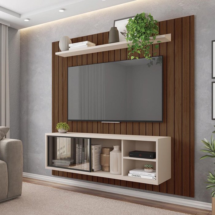 Painel Ripado Para TV Bordeaux Havana Off White Havana Off White