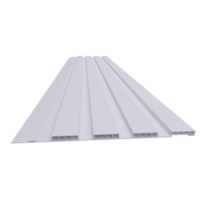 Painel ripado fabricado em PVC, na cor branca e no formato de régua, ideal para revestimento de parede com efeito 3D. Cada peça possui 25 cm de largura e 2,70 m de comprimento, oferecendo um visual clean, versátil e bem definido para ambientes internos.