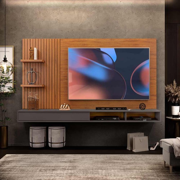 Painel Ripado TV Até 60 Polegadas Freijó Cinza Urbano Brito Shop JM