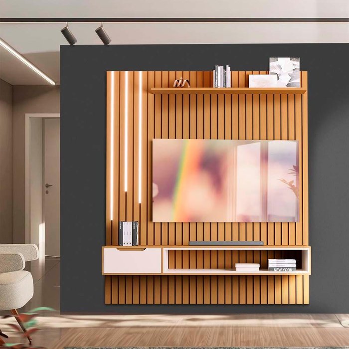 Painel Ripado Tv até 65 Polegadas com Led Nature Pérola Foster Shop Jm