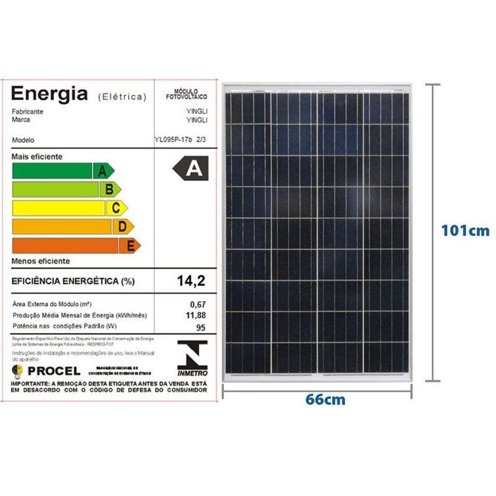 Modelo: YL095P-17B 2/3 células policristalino Módulo Fotovoltaico Marca: Yingli #linha# YL095P-17B Este painel solar para uso residencial e comercial é formado por 36 Células de Silício Policristalino, com dimensão de 1010mmx660mm*35mm, com potência nominal e eficiencia de Area (m2) de 0,67 Potencia (w) de 95 Corrente Impp (a) de 5,23 Producão (kwh/mes) de 11,88 Eficiencia (%) de 14,20 Registro no inmetro: 003947/2012. #linha# Performance elétrica: Potência máxima (Pmax): 95W Tolerâncias de saída de potência: +/- 5% Eficiência do módulo: 14,20% Tensão de máxima potência (Vm): 18,20V Corrente da máxima potência (Im): 5,23A Tensão de circuito aberto (Voc):22,9V Corrente do curto-circuito (Isc): 5,59A Tipo de células: Silício Policristalino Condições de teste padrão: 1000W/m² irradiação, 25°C temperatura do modulo.#linha# CARACTERÍSTICAS DE TEMPERATURA Especificação Dados: Coeficiente de temperatura (Pmáx) -0,45% / °C Coeficiente de temperatura (Voc) -0,37% / °C Coeficiente de temperatura (Isc) 0,06% / °C Temperatura operacional nominal da célula 46±2 °C