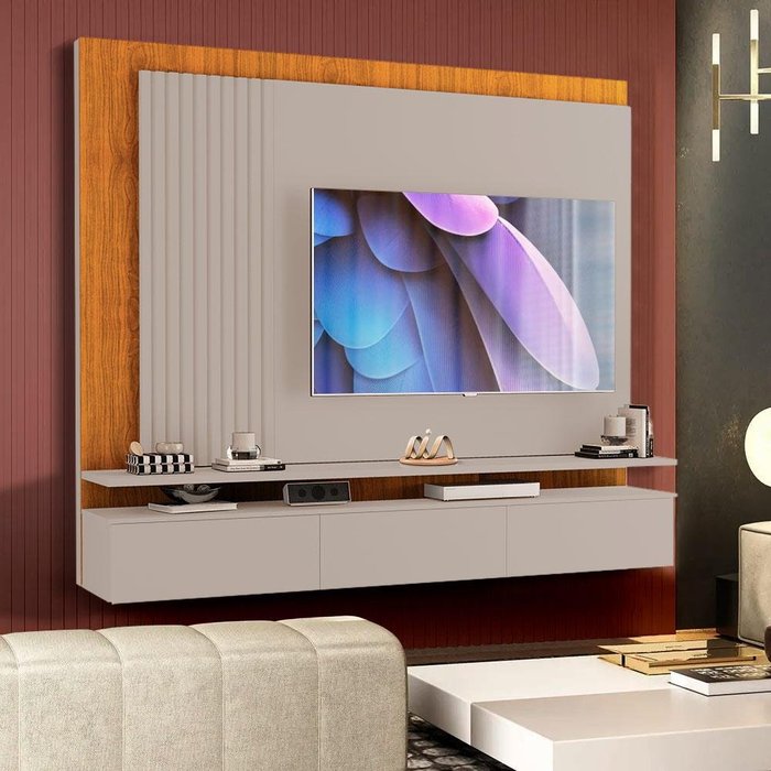 A estrutura em MDF é habilmente complementada pelas faixas de ripado, conferindo um equilíbrio único entre resistência e beleza em nosso projeto de mobiliário.- Estrutura produzida em MDF- Faixas de ripado- 3 Gavetas com corrediças telescópicas- 1 Prateleira- Suporta até 60 polegadasDimensões do produto: Largura 210 cm; Profundidade 44 cm; Altura 180 cm.Itens inclusos: 1 painel Complexidade da montagem: Média, pode ser montado por apenas uma pessoa e/ou necessite de maior conhecimento para montagem.Recomendações de uso, manutenção e limpeza: Limpar com flanela ou pano macio seco, não utilizar produtos abrasivos, desengordurantes, álcool ou solvente. Não expor o produto diretamente a luz solar e à umidade.Garantia: 3 meses.OBS: Foto meramente ilustrativa, objetos, utensílios e decoração não fazem parte do produto.