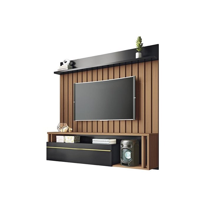 O Painel Suspenso Self tem um visual marcante com o autêntico ripado montado de fábrica. Possui uma porta basculante com pistão a gás, puxador metálico em tom dourado, tampo e prateleira superior com espessura de 25mm e foi produzido em MDP e MDF de 25mm e 15mm.