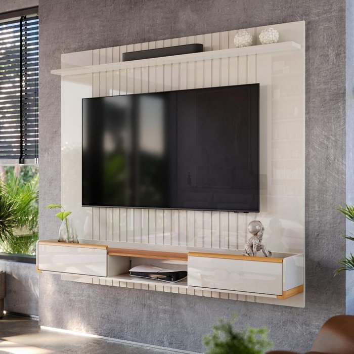 Painel Tv até 70 Polegadas Ripado Atlas 1,86m Lukaliam Móveis Off White/Jequitiba