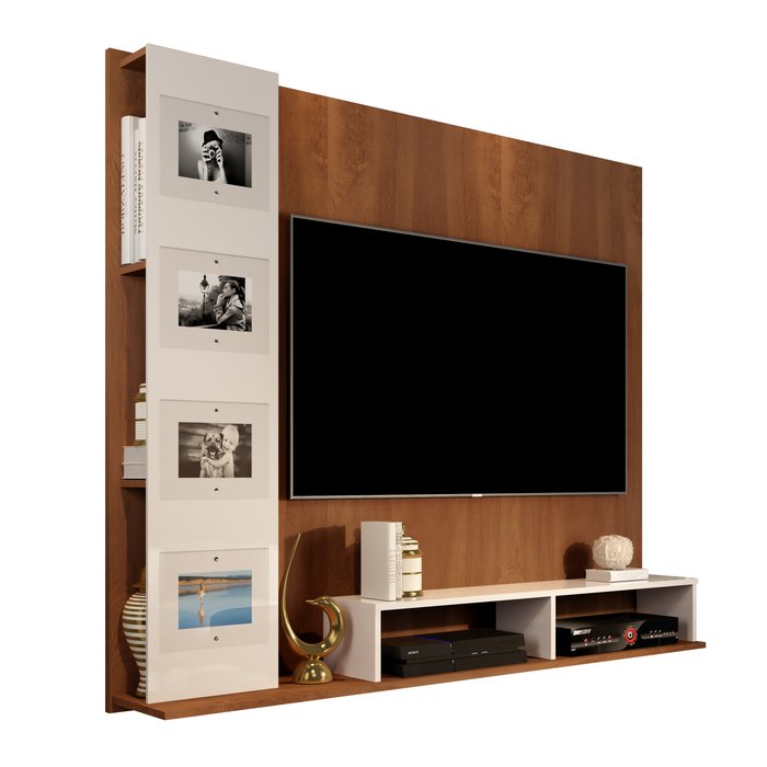 Dimensões do Produto Montado:Altura: 135,5 cmLargura: 160,5 cmProfundidade: 32,5 cmCaracterísticas do produto montado:02 nichos para objetos eletrônicos ou decorativosFabricado em MDPPintura UV com acabamento amadeirado touch em alto relevoPrateleiras atrás do painel do porta retrato;4 Portas retratos em vidro temperado;Espaço para TV: 55"