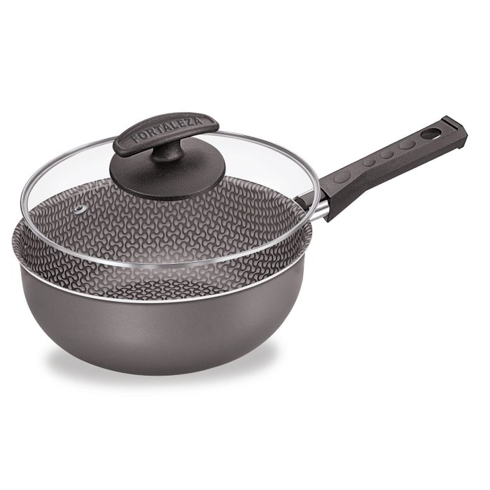 • Composição: Corpo e Rebite em Alumínio Revestimento em Antiaderente Interno e Externo, Tampa em Vidro Temperado com borda em Aço Inox, Cabo e Alça em Baquelite, Pegador da tampa em Nylon