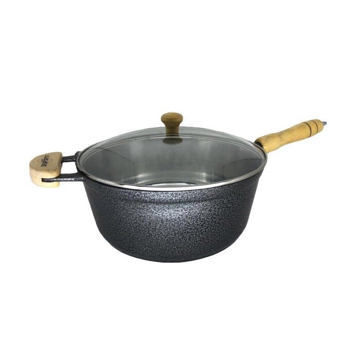 Panela Caçarola Aluminio Preto Cabo e Pomel de Madeira 28 Cm Tampa de Vidro