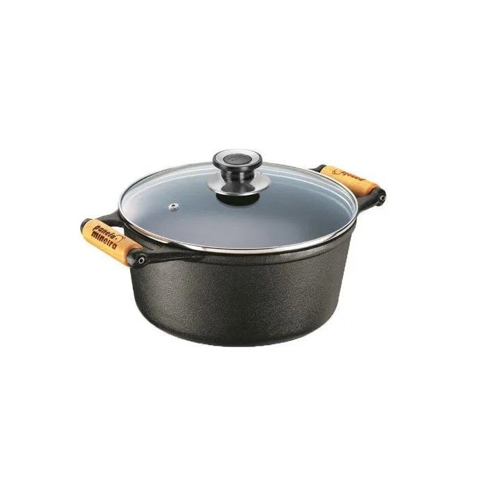 Modelo: Caçarola Ferro Fundido Alça de Madeira Tampa de Vidro