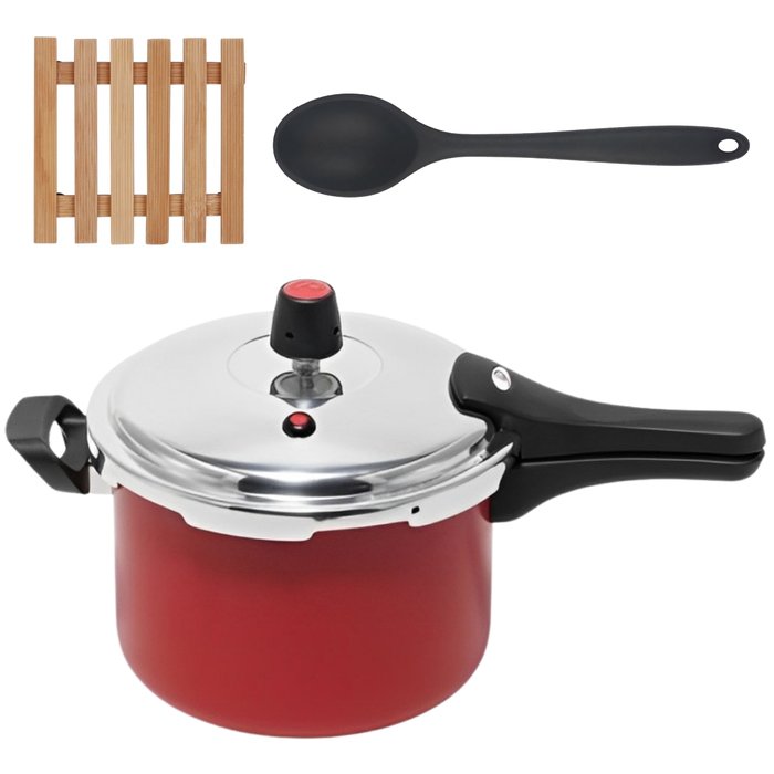 Panela de Pressão 4,5 Litros Antiaderente Fechamento Externo + Descanso Quadrado + Colher de Silicon Cereja