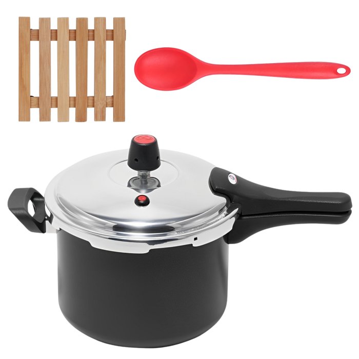 Panela de Pressão 4,5 Litros Antiaderente Fechamento Externo + Descanso Quadrado + Colher de Silicon Preto