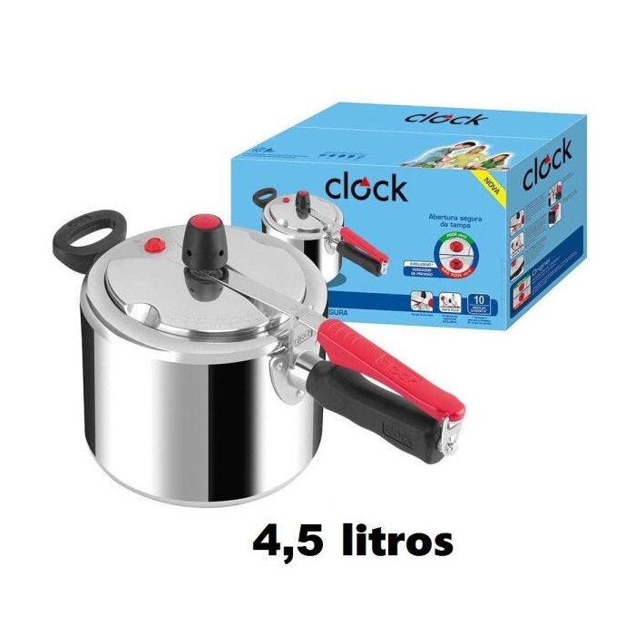 Panela de Pressão 4,5 Litros Clock Especificações Técnicas • Cor: Prateada e detalhes em vermelho e preto; • Peso: 1.139k • Tampa com válvula: Sim - Válvula controladora de pressão; - Válvula de segurança repetitiva; - Safe Plus. • Material: Alumínio Polido; • Capacidade: 4,5 litros. Dimensões do Produto Altura: 16cm Largura: 40cm Profundidade: 14cm Código do Fabricante 27607 EAN: 7896186100022 Marca: Clock