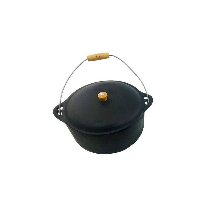 Caldeirão de ferro fundido modelo antigo com alça de madeira com batoque de madeira e tampa de Ferro,