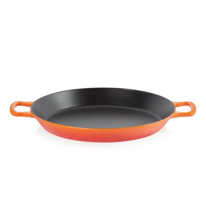 - Especificações: • Cor: Laranja • Tamanho: 34 cm • Porções: 6-8 • Material: Ferro Fundido • Capacidade: 3,1 • Fonte de Calor: Vitrocerâmico, Forno, Gás, Elétrico, Indução, Radiante, Grill • Comprimento: 44 cm • Largura: 35 cm • Altura: 5 cm • Modo de Lavagem: Lava Louças, Lavagem a Mão • País de Origem: França • Garantia: Vitalícia