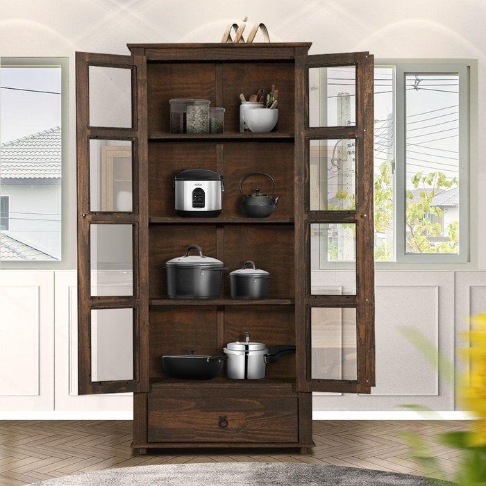 Paneleiro Rústico Madeira Maciça 2 Portas Vidro 1 Gaveta Imbuia Kalyn Jm Móveis