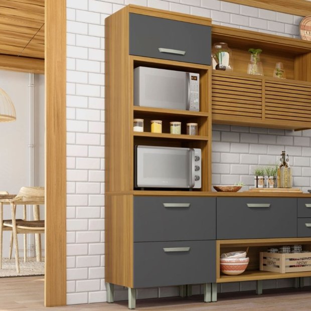 - Dois nichos, micro-ondas e forno elétrico, sendo o nicho de forno elétrico com duto de liberação de calor. Dobradiças grandes caneco 35 nas portas basculantes com pistão a gás. - Modernos puxadores de ABS na cor gold, beleza, qualidade e durabilidade. -