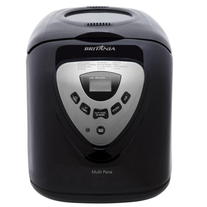 ATENÇÃO: Esse produto não pode ser faturado para CNPJ. Pedimos a gentileza de efetuar a compra com um CPF!Panificadora Britânia Multipane Preta 220VVocê adora pão caseiro, mas só de pensar no trabalho que dá para fazer, desanima? Então a Panificadora Britânia Multipane é a solução ideal para você, pois você pode ter pães fresquinhos todos os dias, sem ter que pôr a mão na massa! Ela faz 4 tamanhos de pão: 450, 600, 900 e 1200 gramas, conforme você desejar. Se você gosta de pães mais escurinhos, pode selecionar essa opção e pronto! Pois ela conta com 3 ajustes da cor do pão: claro, médio e escuro. Tem combinações de até 12 programas diferentes para você escolher, possibilitando que você prepare vários tipos de pães doces e salgados, geleias, pudins, panetones e muito mais! Com função timer, permitindo que você agende o preparo do seu pão com até 13h de antecedência e ele fique pronto na hora desejada. Possui forma removível revestida com base antiaderente, deixando a limpeza muito mais fácil. Para que você possa observar o preparo, tem visor de vidro temperado. Acompanha manual de instruções com diversas receitas.- Bate a massa, descansa e assa.