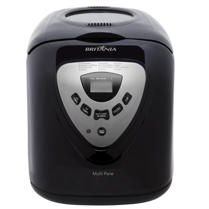 Código do Fornecedor: 64302018 Marca: Britânia Conteúdo da embalagem: 1 Panificadora Elétrica Multipane Britânia Preta Com 12 Funções e Forma Antiaderente 220V Você adora pão caseiro, mas o trabalho envolvido na preparação te desanima? Então a Panificadora Britânia Multipane é a solução perfeita para ter pães fresquinhos todos os dias, sem precisar colocar a mão na massa! Com capacidade para fazer pães de 4 tamanhos diferentes - 450g, 600g, 900g e 1200g - você pode escolher o tamanho que mais se adequa às suas necessidades. Se prefere pães mais escuros, a Multipane oferece 3 ajustes de cor: claro, médio e escuro. Com até 12 programas diferentes, você pode preparar uma variedade de pães doces e salgados, geleias, pudins, panetones e muito mais! Com a função timer, você pode agendar o preparo do seu pão com até 13 horas de antecedência, para que esteja pronto exatamente quando desejar. Além disso, a forma removível revestida com base antiaderente facilita a limpeza após o uso. Para que você possa acompanhar o preparo do seu pão, a Multipane possui um visor de vidro temperado. Acompanha manual de instruções com diversas receitas, copo e colher dosadora, bem como um gancho para remoção do batedor. Composição: Metal, vidro e plástico. Garantia: 12 Meses NA