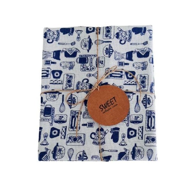 Pano de louça em tecido 100% algodão com alto poder de absorção, com estampa de cozinha azul. Possui alça para pendurar na cor azul.
