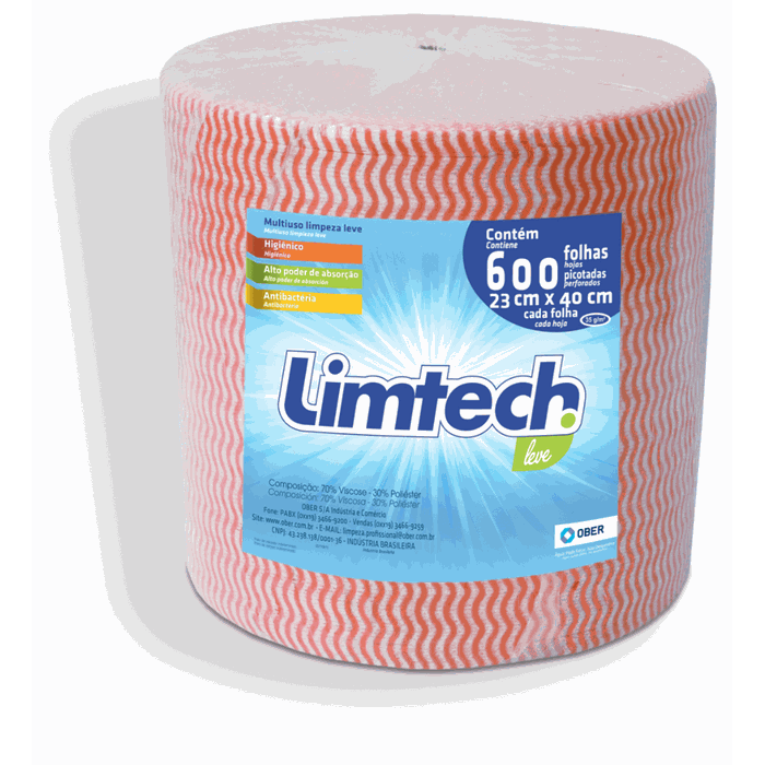 Descrição:Surpreenda-se na hora da limpeza com ótima absorção, praticidade e respeito à natureza. Produzidos com alta tecnologia Spunlace, processo a jato de água, asseguram resistência e maior durabilidade em seus diferentes tipos de uso. Os panos já vêm picotados e são reutilizáveis.Características:Tipo: Pano MultiusoGramatura: 35g/m²AntibacterianaComposição: 70% Viscose e 30% PoliésterConteúdo e Dimensões:01 Rolo de 240m com 600 FolhasCada Folha mede 23cm x 40cmInstruções de Conservação:* Lavagem a mão* Não alvejar* Não secar em tambor* Secagem em varal* Não passar a ferro* Não limpar a seco* Limpeza a úmido profissional, processo normalInformações Técnicas:Modelo: LimtechMarca: OberAviso:Foto: Imagem Meramente Ilustrativa.Garantia (Fabricante): Contra Defeitos de Fabricação.