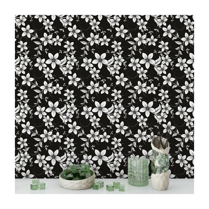Papel de Parede Adesivo Floral Preto e Branco - 8 Rolos 300x50cm
