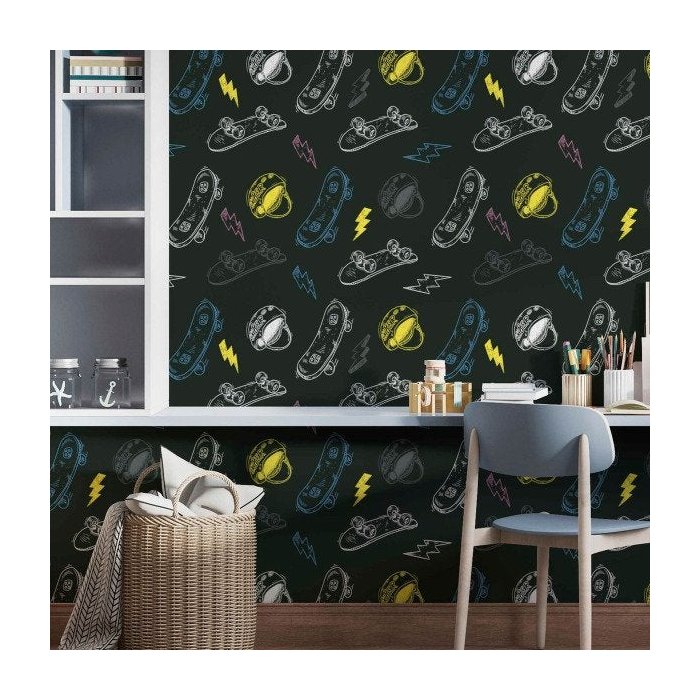 Papel de Parede Adesivo Skate Preto Quarto Teen Rolo 12m