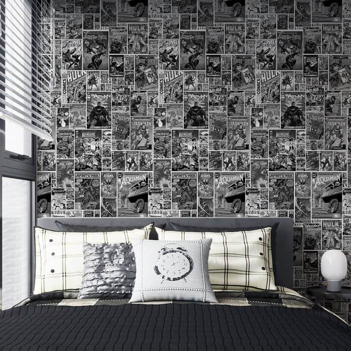 Papel de Parede Adesivo Teens Geek Quadrinhos HQ Super-heróis Marvel Dc Preto e Branco