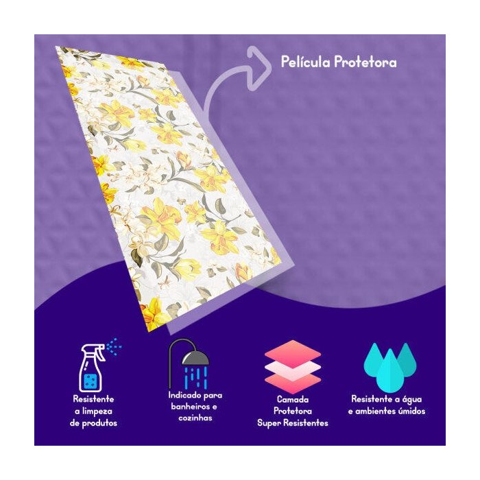 Papel de parede com película de proteção contra respingos de água e umidade do ambiente. A película deixa o papel mais resistente, além de evitar danos contra o papel de parede.