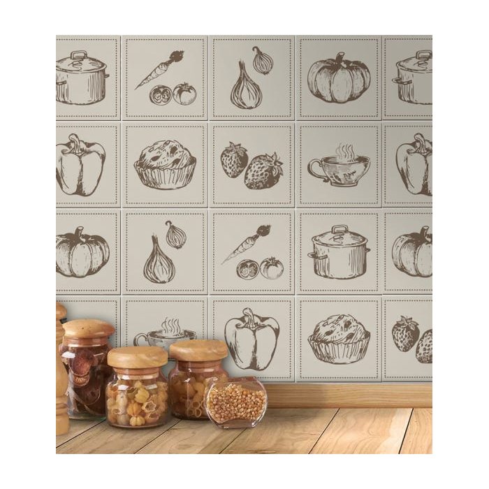 Papel de Parede Autocolante Alimentos Morango Cenoura Cebola Panela Para Cozinha Bege