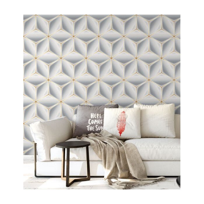 Papel De Parede Branco Cinza Com Detalhes Amarelo Para Sala Quarto Com Efeito 3D