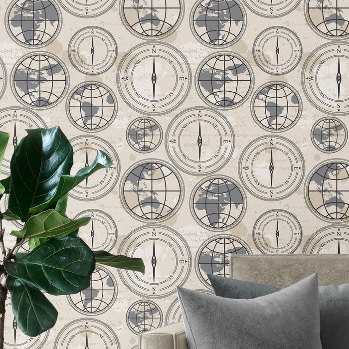 Papel de Parede Bussolo Globo Terrestre Autocolante Lavável Tons de Bege e Cinza