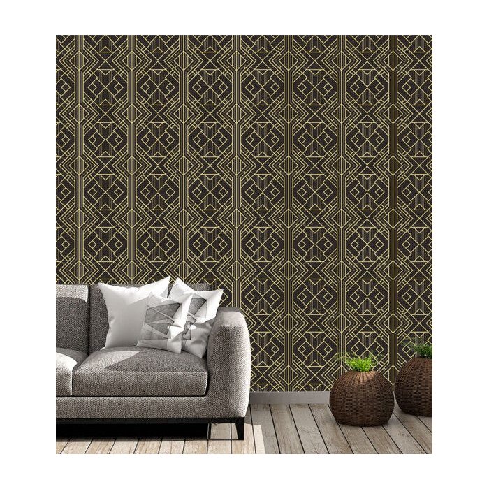 Papel De Parede Estilo Geometrico Fundo Preto Com Bege Modelo Imperial Para Quarto Sala