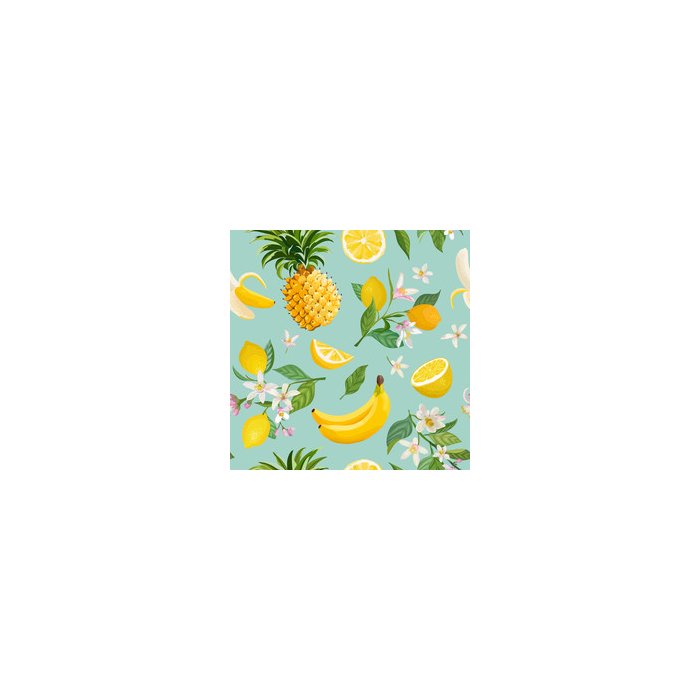 Papel de Parede frutas tropicais com limão, banana, abacaxi, frutas, folhas, flores de fundo. ilustr
