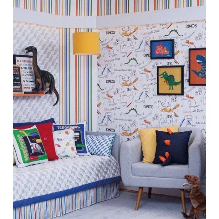 Traz estampas adamascadas, florais, chevron, estrelas, losangos, dinossauros, cidade de Londres, listras e lisos para compor o ambiente. Papel de Parede Bobinex Renascer é indicado para ser aplicado em: Quarto Infantil, Quarto de Bebê Menina e Quarto de Bebê Menino.