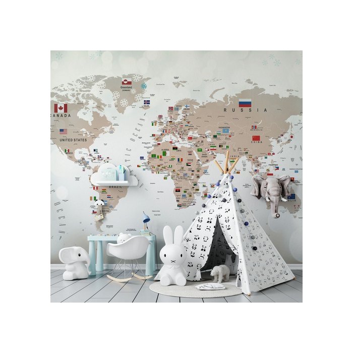Papel De Parede Infantil De Mapa Mundi Bege Com As Bandeiras
