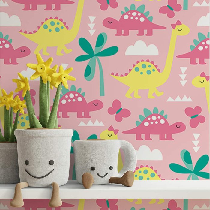 Papel de Parede Infantil Dinossauros Coloridas Fundo Rosa-60x300cm Rosa