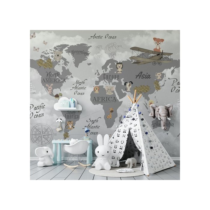 Papel De Parede Infantil Mapa Mundi Cinza Escuro Com Nuvens Cinza Escuro