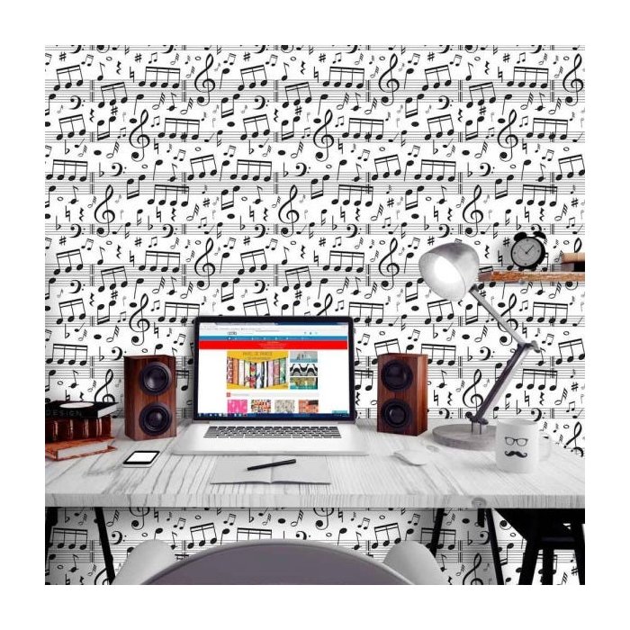 Decore sua casa sem fazer sujeiras. Dê uma nova vida aos ambientes de uma forma simples e fácil. O Papel de Parede Notas Musicais P&B é um adesivo autocolante, não necessitando de cola como os papéis de paredes convencionais, basta remover a película protetora e fixar na parede, sempre limpa e seca, simples assim! - Fabricado com adesivos 3M, garantindo assim sua qualidade e durabilidade. - Tem espessura de 0,10mm e acabamento fosco para que a iluminação não seja refletida. - Adapta-se em diversas superfícies como paredes, azulejos, portas, móveis, vidros ou qualquer superfície lisa.