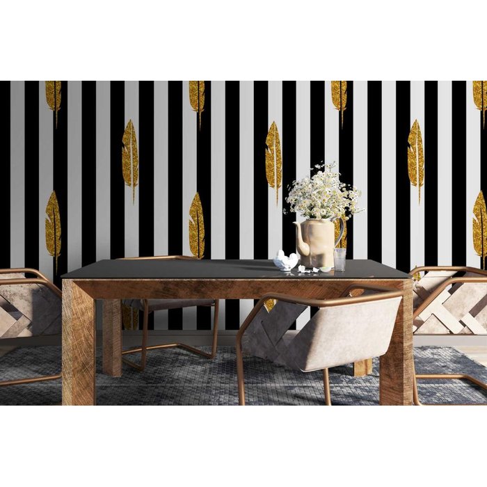 Papel de Parede Preto com Listras Brancas e Pena Dourada-2.5M