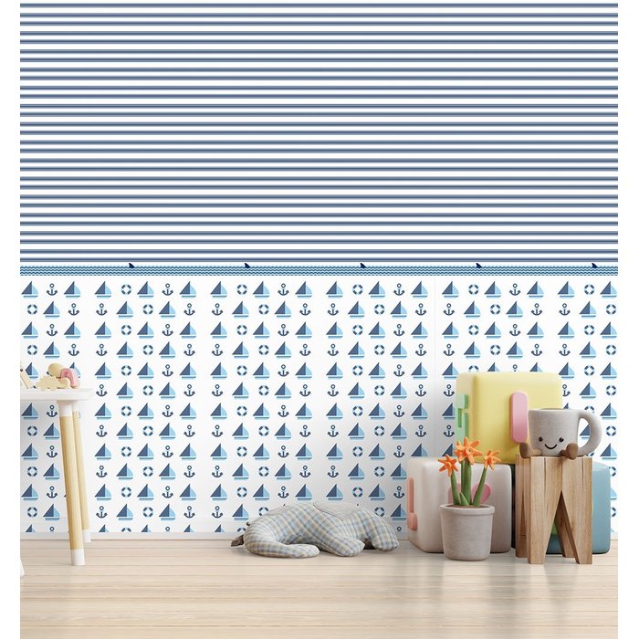 Papel de Parede com ilustração de barquinhos, âncoras e boias,, ideal para quarto para bebês recém nascidos e crianças