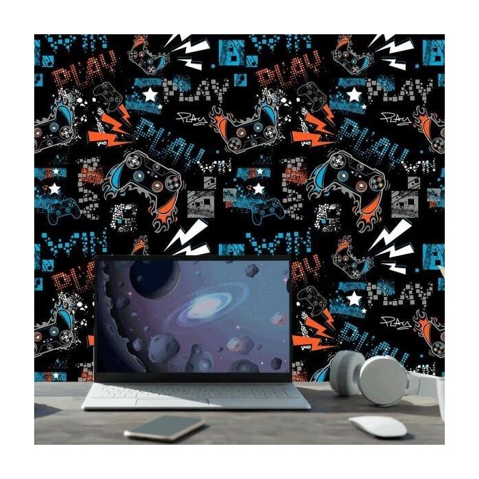 Papel De Parede Quarto Gamer Play No Jogo 2,50m Fundo Preto