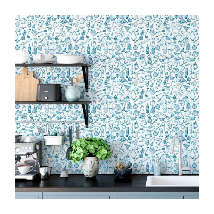 Papel de Parede Vinil Adesivo Utensilios Cozinha Azul 10m