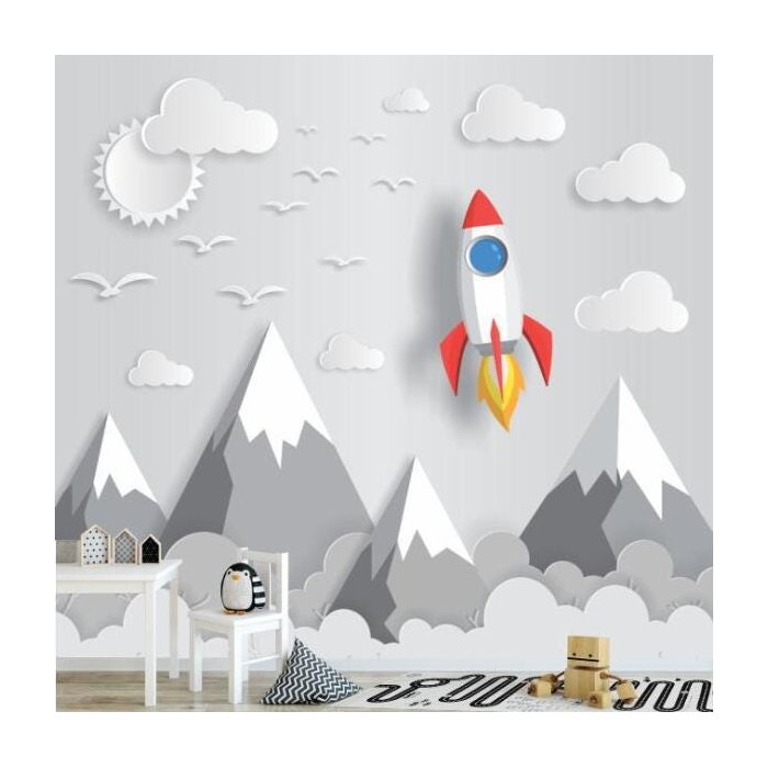 Papel Parede Infantil Cinza Montanha Paisagem Foguete Gg659
