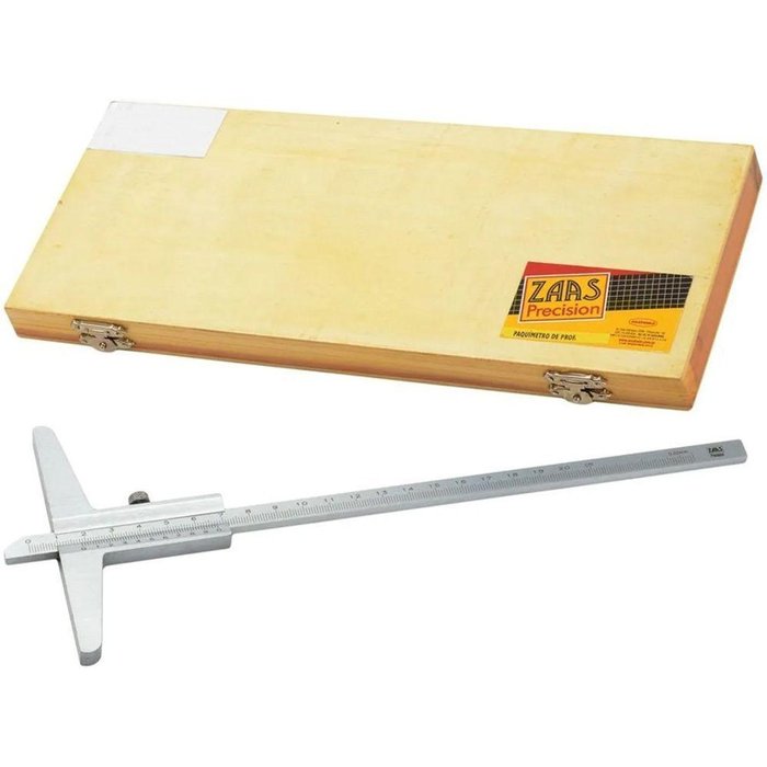 Paquímetro De Profundidade - Cap. 0-300mm - Ref. 01,0012 - ZAAS O Paquímetro de Profundidade é um instrumento utilizado para medir com precisão a profundidade de objetos e partes de objetos como furos não vazados, rasgos, rebaixos, encaixes entre outros. ESPECIFICAÇÕES: - Paquímetro de Profundidade;