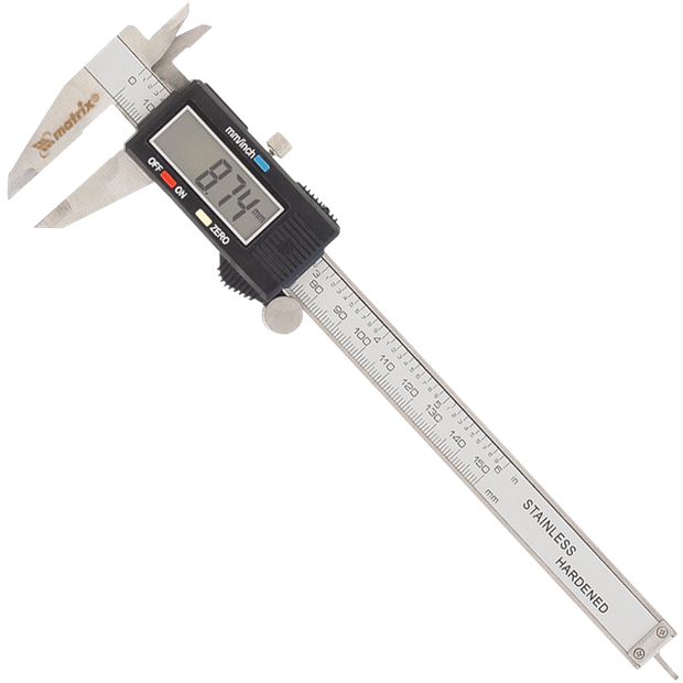 Paquimetro e feito de aco inoxidavel ferramenta. Deslocando cursor movel sobre o haste da ferramenta as medicoes sao mostradas no display LCD. Fonte de alimentacao e uma bateria de 1,5 V, tipo SR44. Erro de medicao e 0,02 mm (100 mm) 0,03 mm (100–200 mm). Embalado em uma caixa de plastico com espuma de borracha que cobre o interior, excluindo a possibilidade de danos devido a golpes e quedas.