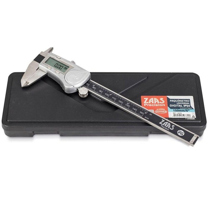 Paquímetro Digital Com Proteção IP54 - 150mm/6" - Resolução 0,01mm - 01,0016 - ZAAS O Paquímetro é um instrumento de medição utilizado para medir com precisão as dimensões lineares internas/externas e de profundidade de uma peça. ESPECIFICAÇÕES: - Paquímetro Universal Digital Com Nível de Proteção IP54;