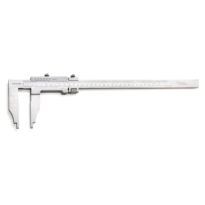 | Detalhes Técnicos | Fabricados em aço inoxidável temperado Faces de medição internas arredondadas Cursor monobloco Escala e cursor cromados fosco Ajuste fino Parafuso de fixação da medida Deslize do cursor sobre guias ressaltadas, impedindo o desgaste da gravação Resolução de 0,02mm/.001" |