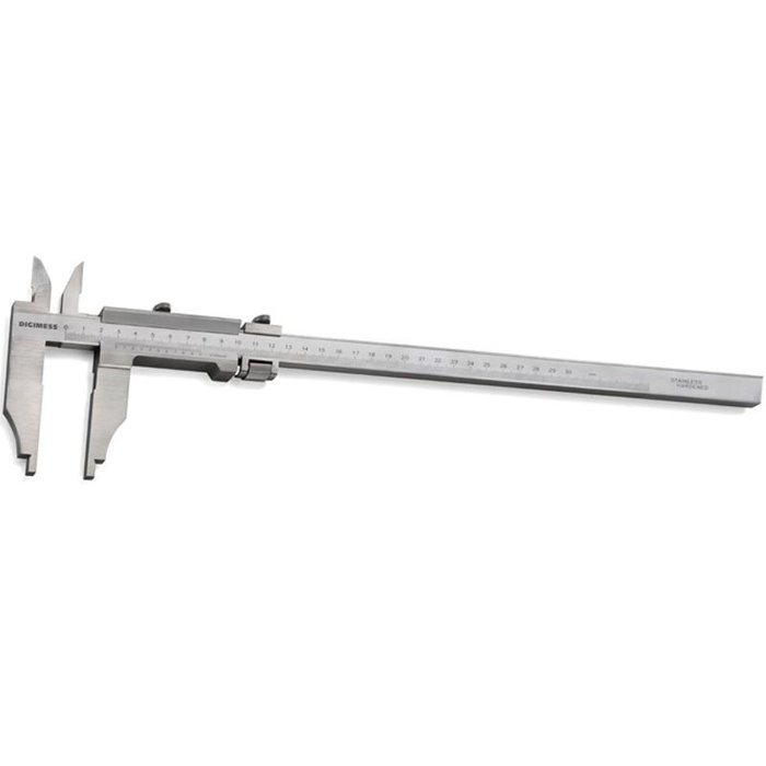 Paquímetro Para Serviço Pesado Com Orelhas Para Medição Interna - Cap. 1000mm - Prof. Do Bico 150 mm - Graduação 0,02mm - DIGIMESS O Paquímetro é um instrumento de medição utilizado para medir com precisão as dimensões lineares internas/externas e de profundidade de uma peça. Trata-se de uma régua graduada, com encosto fixo, sobre a qual desliza um cursor. ESPECIFICAÇÕES: - Fabricados em aço inoxidável temperado;