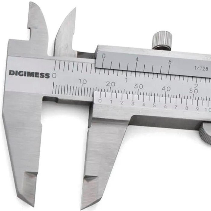 Paquimetro Med. Universal 150mm/6' ( 0,05mm/1/128') - DIGIMESS O Paquímetro é um instrumento de medição utilizado para medir com precisão as dimensões lineares internas/externas e de profundidade de uma peça. Trata-se de uma régua graduada, com encosto fixo, sobre a qual desliza um cursor. ESPECIFICAÇÕES TÉCNICAS PAQUÍMETRO - Marca: DIGIMESS;