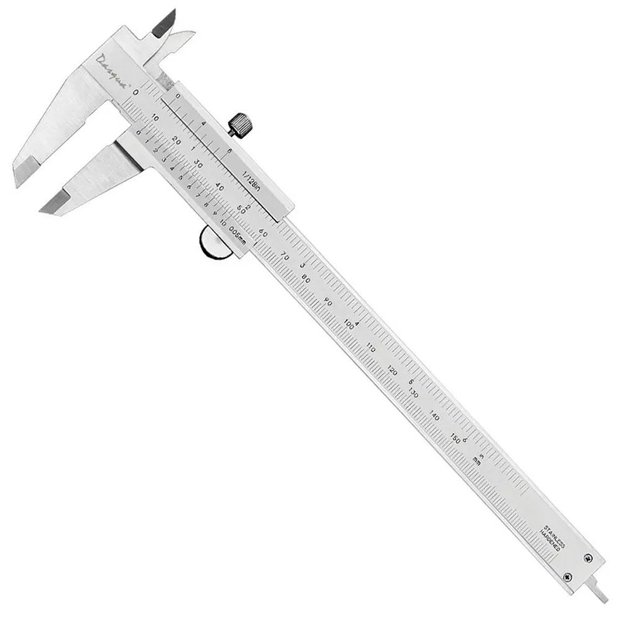 Este paquímetro analógico de 150 mm da Dasqua é indicado para medição externa e interna de peças na linha de produção, laboratório de qualidade e ferramentaria